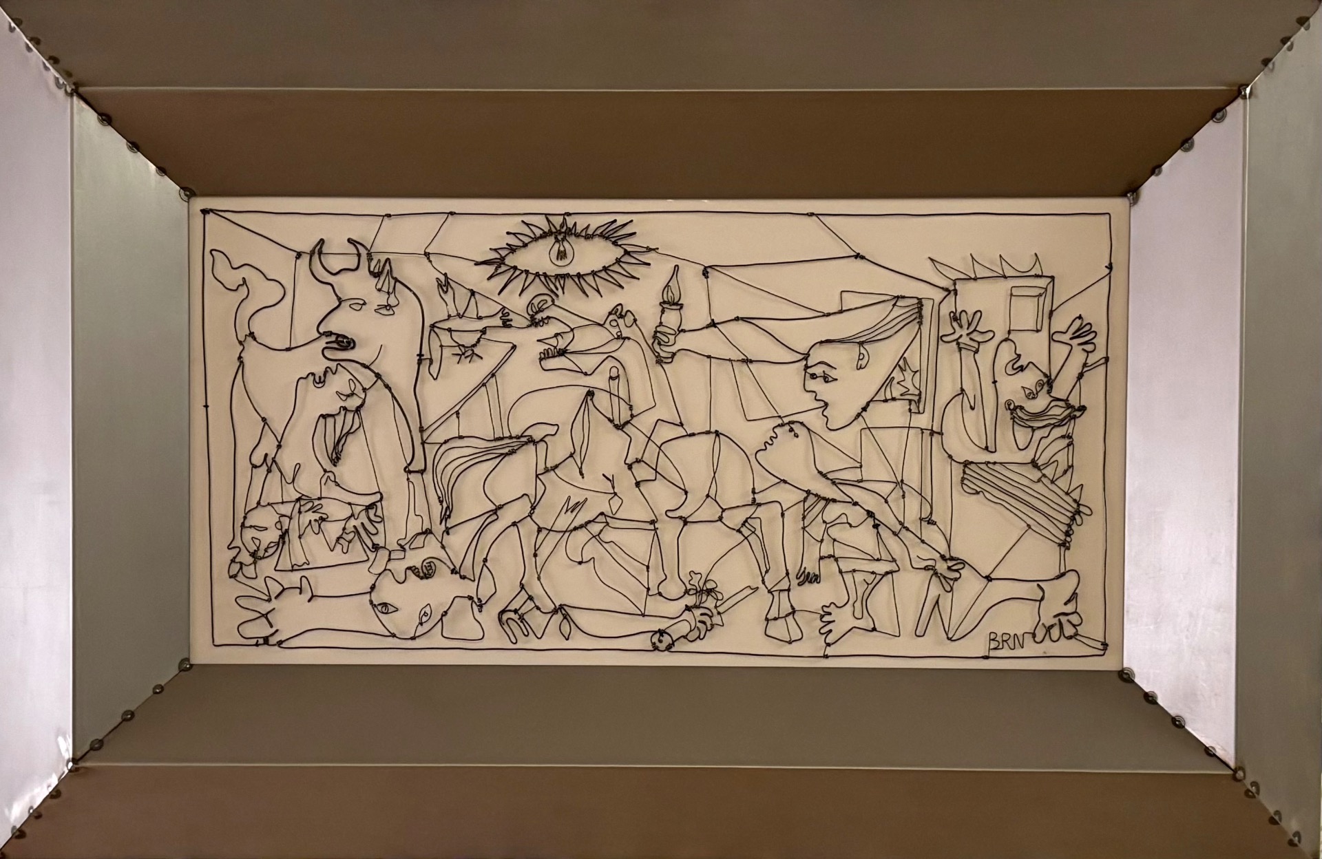 En ståltrådsvariant av Picassos Guernica 1937 Mått52x80 cm. Ramen har tillverkats av Vännäs Plåt
